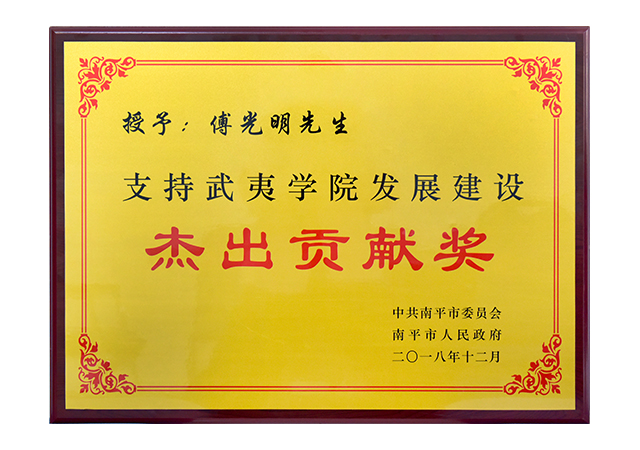 南平市委、市政府授予傅光明“支持武夷学院发展建设杰出贡献奖”,希望全市广大企业家以傅光明为榜样,深入学习贯彻习近平新时代中国特色社会主义思想和党的十九大精神,大力弘扬企业家精神,奋发有为、砥砺前行,为加快南平绿色发展推动高质量发展落实赶超作出积极贡献。