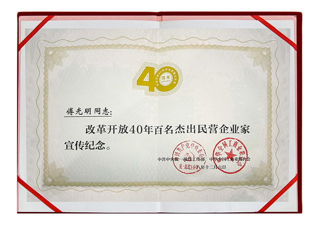 傅光明董事长荣获改革开放40年杰出民营企业家纪念章